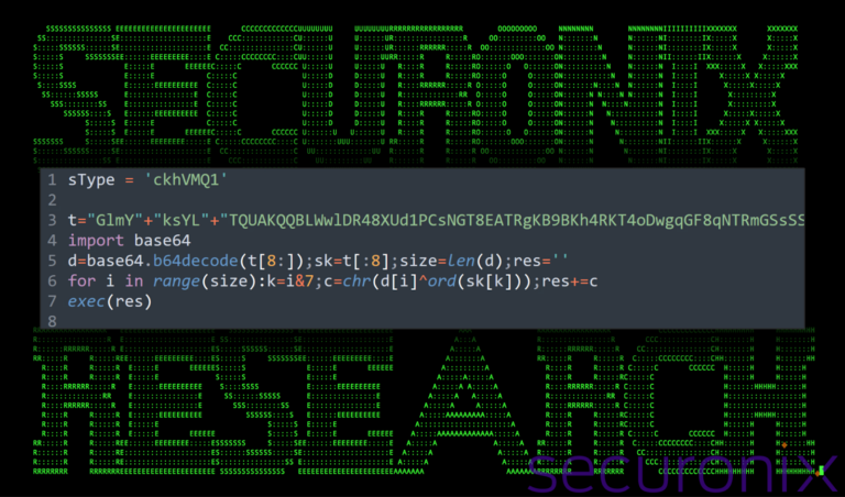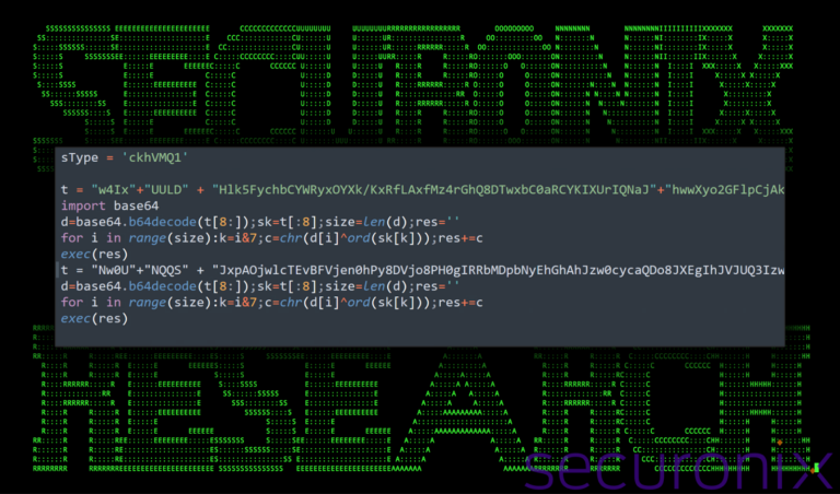 The file contains a large base64 payload and uses a combination of string manipulation and decoding to execute the Python code hidden inside of it. Base64 encoding and XOR logic are used for the content behind the hidden string. This is then executed as Python code using exec().