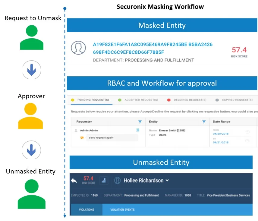 Securonix provides you with the capability to mask direct identifiers such as a user’s name, account information, their activities, and the resources they use. Only users assigned a Privacy Master role can unmask this information.