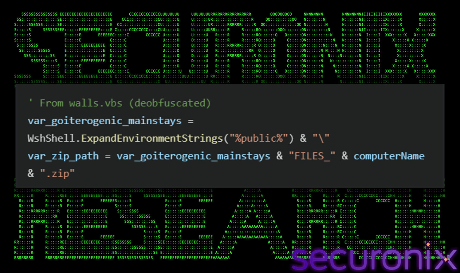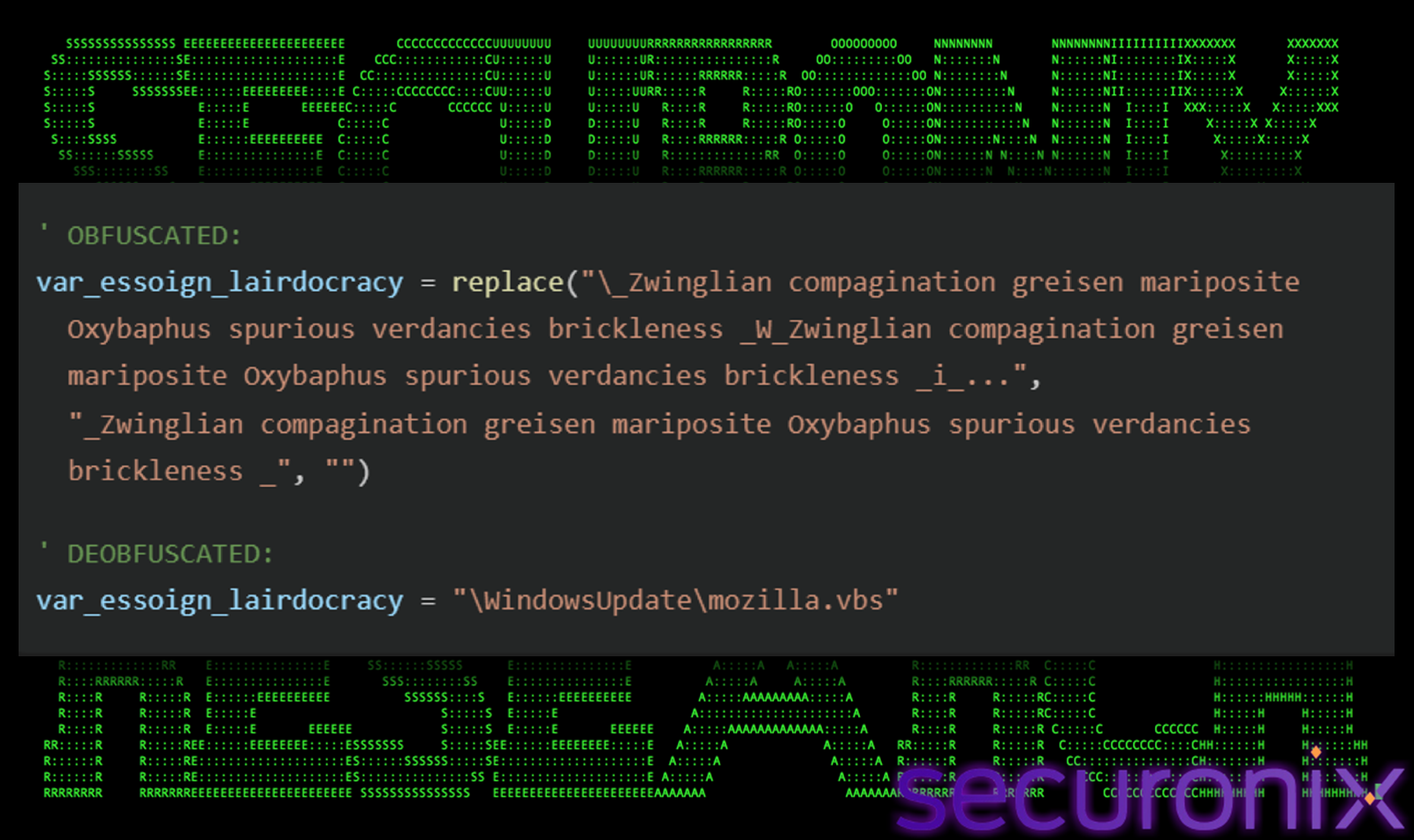 The 266 executable lines are themselves heavily obfuscated using a distinctive “Replace()” pattern. Each critical string is constructed by separating individual characters with long, unique junk phrases that are stripped at runtime.