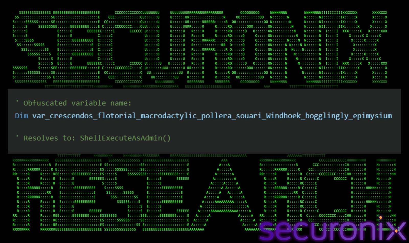 This variable once deobfuscated, resolves to the “ShellExecuteAsAdmin()” subroutine.