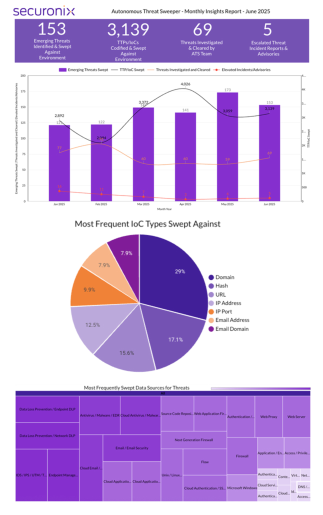 Last month Securonix Autonomous Threat Sweeper identified and analyzed 3,139 TTPs and IoCs, 153 emerging threats, investigated 69 potential threats, and elevated 5 threat incidents. The top data sources swept against include IDS / IPS / UTM / Threat Detection, Data Loss Prevention, Endpoint Management Systems, and Email / Email Security.