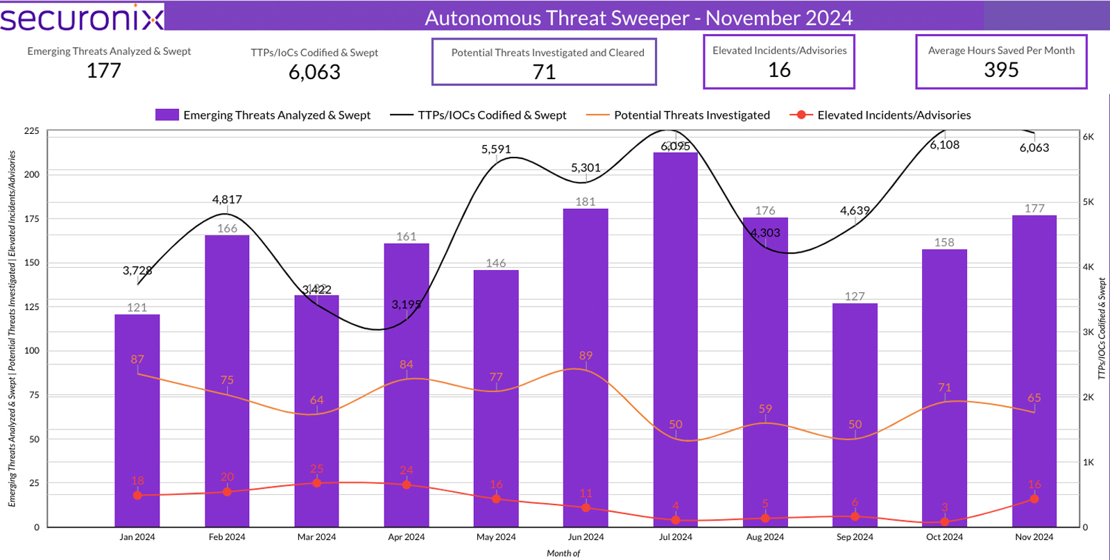 The Monthly Intelligence Insights provides a summary of top threats curated, monitored, and analyzed by Securonix Threat Labs in November 2024. The report additionally provides a synopsis of the threats; indicators of compromise (IoCs); tactics, techniques, and procedures (TTPs); and related tags. Each threat has a comprehensive summary from Threat Labs and search queries from the Threat Research team. For additional information on Threat Labs and related search queries used via Autonomous Threat Sweeper to detect the below-mentioned threats, refer to our Threat Labs home page.