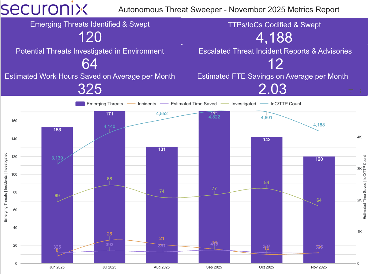In November 2025, the Autonomous Threat Sweeper team observed a broad escalation in global cyber activity marked by state-backed espionage, credential theft, cloud intrusion, and aggressive ransomware operations. Key campaigns included Operation SkyCloak, Peek-a-Baku in Central Asia, MuddyWater’s Phoenix v4, SmudgedSerpent’s Iranian credential harvesting activity, and Lazarus deploying a new Comebacker variant, along with continued targeting from UNC1549 across aerospace and defense. Threat actors expanded their malware ecosystems with Kinsing exploiting ActiveMQ for backdoor deployment, NotDoor abusing Outlook for C2 and persistence, COLDPRIVER rolling out its latest toolset, and TruffleNet driving large-scale cloud credential abuse, while CHAMELEON#NET pushed FormBook through DarkTortilla. The month also saw a jump in AI-enabled malware and macOS infections distributed through malicious AppleScript, deepening attacker automation. Ransomware pressure increased with new Kraken variants, ongoing Akira attacks, the Lynx intrusion campaign, and the reemergence of ShadowRay 2.0, reinforcing how quickly adversaries are combining AI, cloud exploitation, and identity-focused techniques to accelerate intrusions.