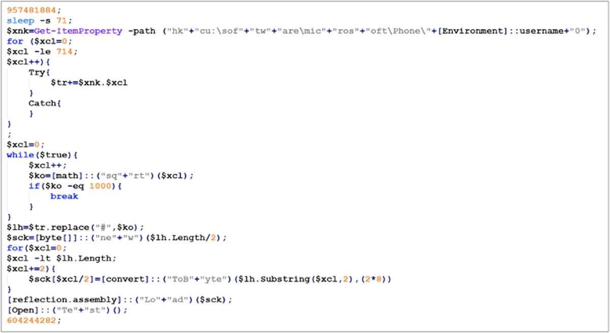 For example, the pyrolyzing505 registry key established backdoor communications with the attacker’s remote C2 server. Once connection was established, it would call and execute the run key which would call and execute further stages. This was done by loading the content of the keys directly into the system’s memory using the Get-ItemProperty PowerShell commandlet and storing that into a variable. The contents of that variable would then be invoked using Invoke-Expression.
