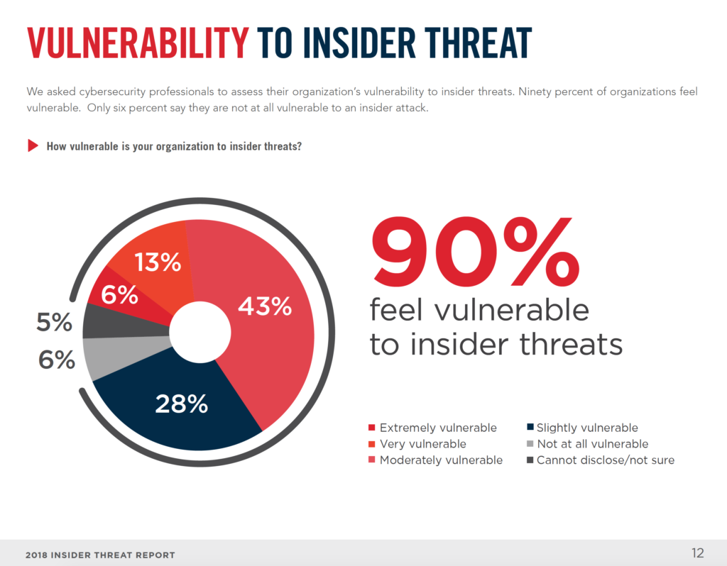 We’ve all seen big data breaches in the news. We also know there are many more breaches that did not make it into the evening news. The insider attack vector – whether it is a malicious insider, an unsuspecting compromised employee, or accidental misuse, is a common theme across most of these data breaches. According to the 2018 Inside Threat Report by Cybersecurity Insiders 90% of organizations surveyed feel vulnerable to insider threats.