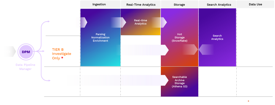 Tier C is designed for logs required for compliance or historical reference that have low security value in day-to-day operations. These include firewall logs, printer activity, or verbose system logs. Rather than overloading your SIEM or driving up storage costs, this telemetry is archived in low-cost storage (like AWS S3 or Snowflake) and remains fully searchable, enabling long-term retention without breaking your budget.